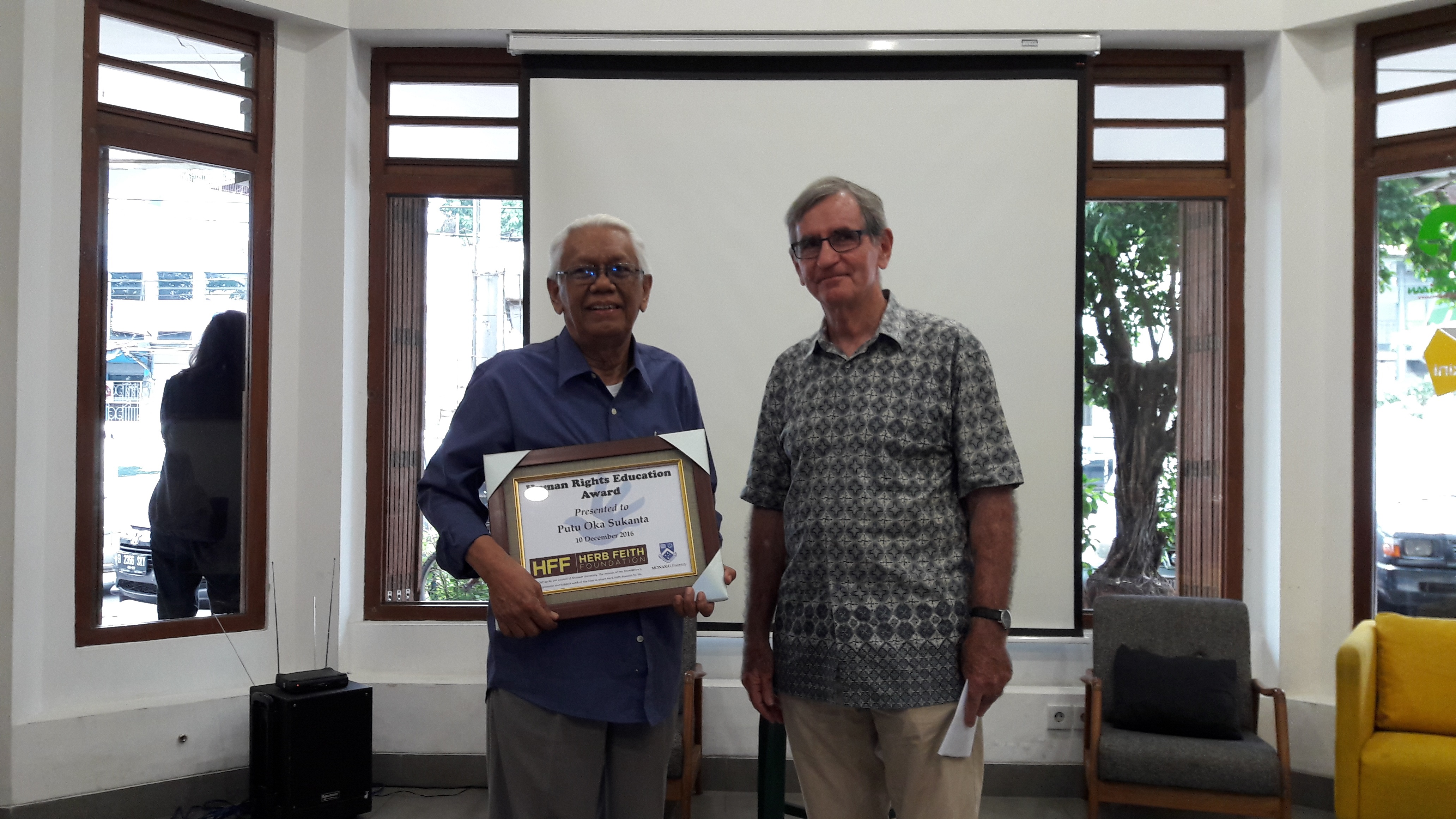 The Herb Feith Foundation gave its inaugural human rights education award to Putu Oka Sukanta. Pat Walsh presented the award.