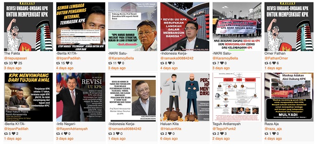 In response to these protests, pro-government forces financed online public opinion manipulation in order to gain acceptance for the controversial legislation. To increase public support for the revision of the KPK Law, cyber mercenaries were mobilised to steer online discussions on the topic towards a pro-revision narrative, by bombing social media, especially Twitter, with pro-revision messages, memes and hashtags.