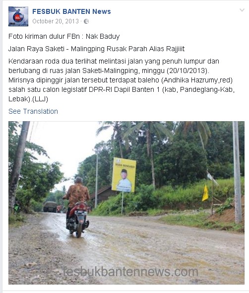A two-wheeler is seen riding along a road full of mud and potholes between Saketi–Malingping on Sunday (20/10/2013). Ironically, on the side of the road there is a billboard (for Andhika Hazrumy [Ratu Atut’s son]) for a national legislative election candidate from Banten Area 1 (Pandeglang and Lebak Regency). (LLJ)
