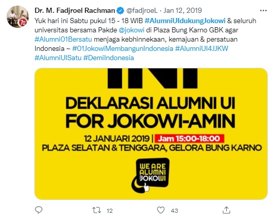 For example, when Jokowi visited Padang on the campaign trail, the narrative that dominated on Twitter was the uniqueness and beauty of the region and its people. Another frequently chosen topic was the support of prominent people for Jokowi. One occasion that was magnified on social media was when the alumni association of the University of Indonesia (UI Alumni) expressed their support for Jokowi during one of Jokowi’s rallies at the Bung Karno Stadium in Jakarta, in January 2019. Promptly, Twitter was flooded with the hashtags #AlumniUIDukungJokowi (‘UI Alumni Support Jokowi’) and #AlumniUI4JKW (‘UI Alumni for Jokowi’).