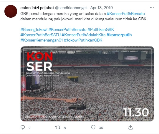 For Sengkuni, ‘the most successful hashtags in the big campaign, were those [we launched] during the white concert before voting day’. The United White Concert was held at the Bung Karno Stadium on 13 April, to conclude Jokowi’s national campaign. With its star-studded line-up of famous musicians, artists, religious leaders and politicians, the social media posts about this event easily went viral. With a series of pre-planned hashtags such as #KonserPutihBerSATU (‘United White Concert’, with ‘satu’ or ‘one’ in the word ‘united’ capitalised to indicate Jokowi’s ballot number), #BarengJokowi (‘together with Jokowi’), and #KonserPutihAdalahKita (‘the white concert is us’) Sengkuni and his team members generated a lot of attention across multiple social media platforms. Moreover, Sengkuni recalled, the campaign ‘was supported by all the influencers simultaneously, bro. Wow, this broke the records. The topic became trending in no time’. This further helped to raise the event’s prominence in the mainstream media, which in turn prompted a mass volume of Twitter conversations on the topic by ordinary netizens.