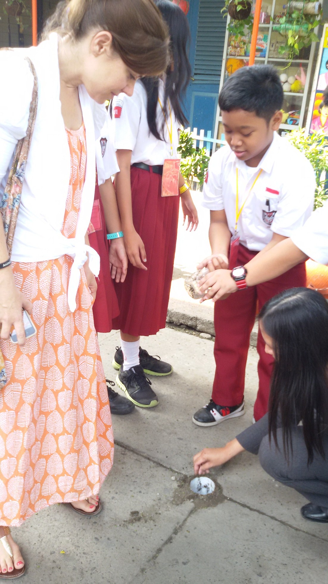 Primary school students demonstrating how biopore works - Credit: Kelsie Prabawa-Sear