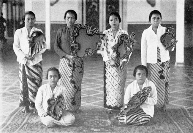 The kain simbut (cotton blanket) discussed in Chapter 3, for example, is revelatory in depicting the visual power of secrets in Sunda. This is different from the refined aesthetics of nature that usually dominate discussions about textiles from the Surakarta and Yogyakarta courts. The colour of the kain simbut is created by smearing dye with the brush of a coconut husk. The cloth itself is typically monochromatic and with a coarser weave, whose iconography emphasises talismanic protective forms. This process stands in sharp contrast to the delicately drawn klacap kumitir (shivering flashes) motif worn by a ceremonial guard at the Yogyakarta palace, which is made from the finest cloth and hand drawn with utmost attention to detail.