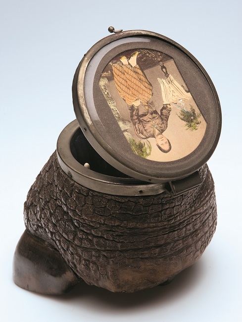 The legend is accompanied by a photograph of the consort of a Sundanese district head seated at her spinning wheel (circa 1910). Djajasoebrata introduces a late nineteenth-century sewing box belonging to this consort now held in the Dutch collection at the Stichting National Museum of World Cultures. Its base is made from the hoof of a rhinoceros – an animal that, according to the legend, is said to test the will of the prince. In addition to its symbolic meaning, rhinoceros skin is a particular aesthetic depicted in the jamblang (checkered) pattern popular in the woven cloths worn by Sundanese men. The metal lid of the box is secured with a clasp with a hand-tinted photograph of the Javanese woman who gifted the sewing box, signaling the sentimentality of women’s work in colonial Java. The combination of nature and modern technologies brings domestic and foreign aesthetics into one orbit. The same is true of the commerce side of Dutch-Indonesian relationships.