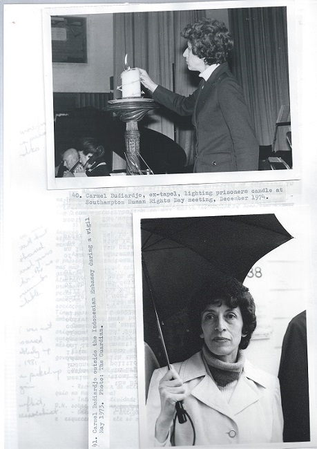 Upon arriving in London, Carmel used the connections she had in Amnesty and almost immediately set to work to help the prisoners she left behind. She felt compelled to act in response to the Indonesian repression. She wrote an extensive report for Amnesty on the conditions in Indonesian prisons and cases of torture and the names, stories and locations of prisoners she had met in detention. This led to Amnesty adopting some of women prisoners as cases in their campaign.