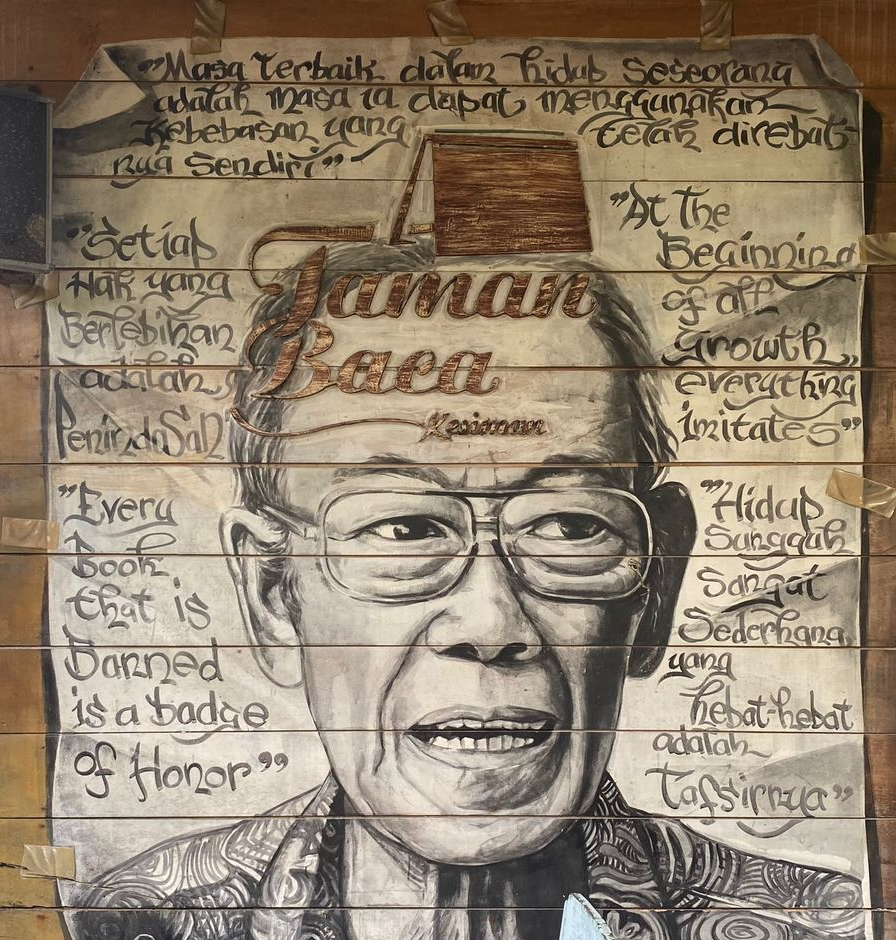Reformasi activist Budiman Sudjatmiko credits the great saga written in the labor camp for ‘opening our eyes’ and helping activists imagine how a ‘global perspective was planted in the youth at that time.’ Especially important to the student activists was the portrayal in the final novel, House of Glass, of the secret police agent who arrests Minke, the protagonist of the first three novels, and drags him off to the Moluccas. The Quartet’s depiction of the fissures that could weaken democratic movements showed the activists that they needed to band together in a broader coalition. This was vital in the months leading to the birth of a new party, the Indonesian Democratic Party, or PRD, Sudjatmiko recalled in a 2022 interview. They would often visit Pramoedya at his house, where they spoke with him about Indonesian historical events before and after independence. ‘We discussed history, war, culture—and it influenced our oratory.’ They even took quotes directly from his books.